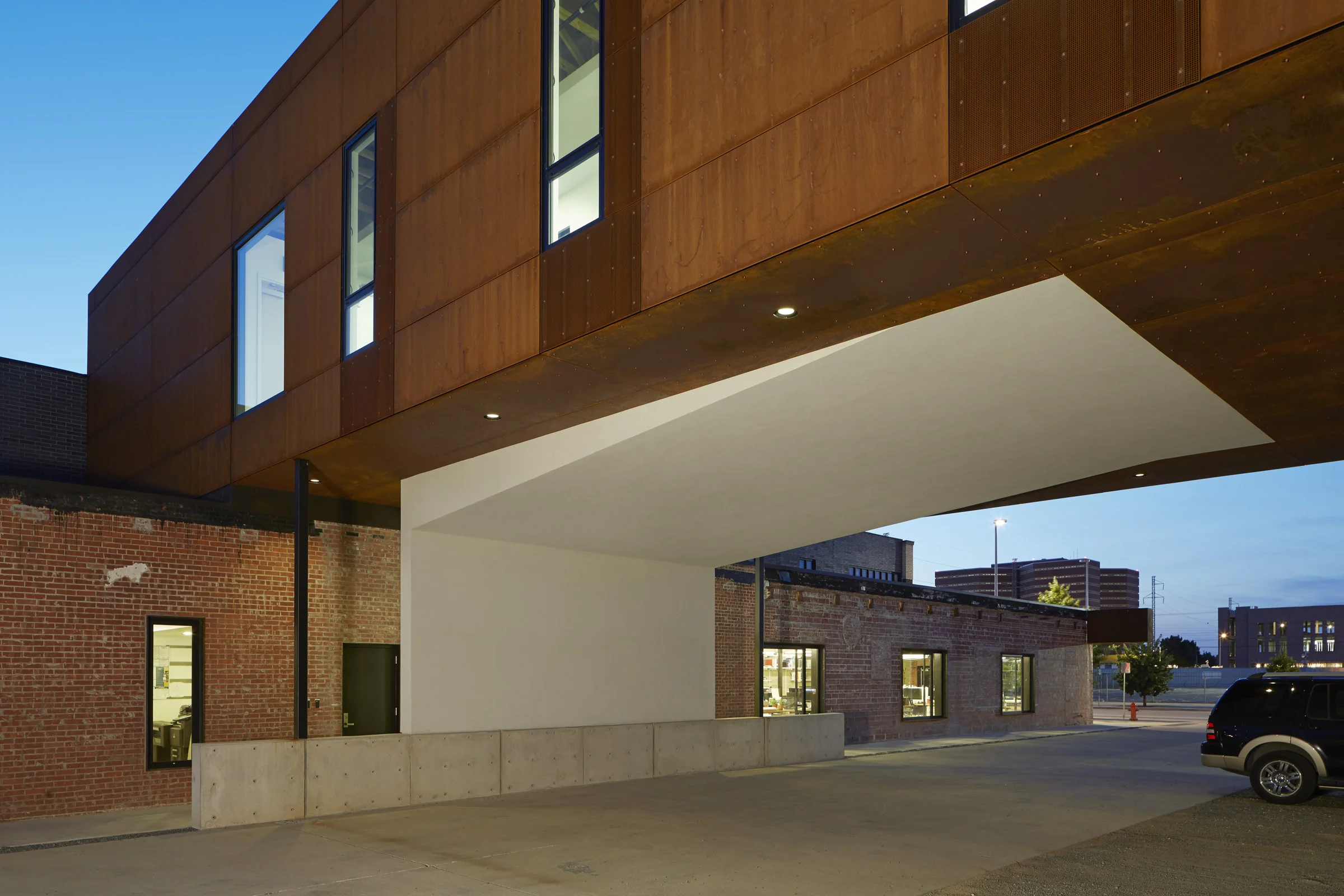 In addition to the re-use of the existing shell, sustainable strategies employed by the proposal are, among others, the placement of shaded operable windows on the north and east facades, the employment of a rain screen façade system on the entire addition and portions of the existing structure, the use of recycled structural materials (steel and engineered lumber), and the installation of a geothermal comfort system.