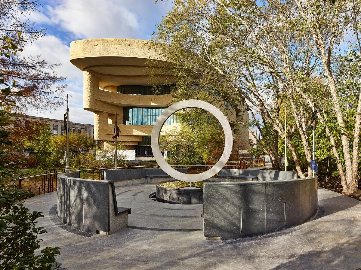 Selected through an international competition, the memorial design is organized around Oklahoma artist Harvey Pratt’s (Cheyenne-Arapaho) “Warrior’s Circle of Honor,” an elevated stainless-steel circle that symbolizes cycles of life, death, and unity among Native veterans.