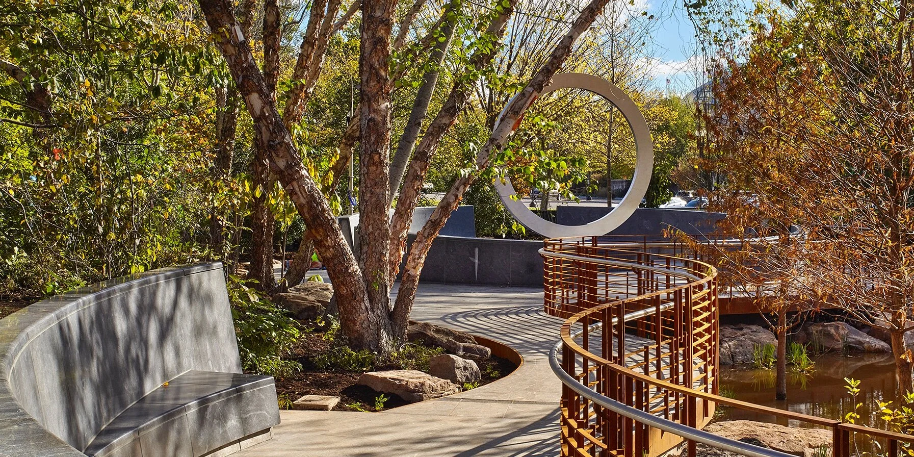 Through an engagement process that consulted museum stakeholders and federal agencies, the memorial was carefully located within the existing NMAI landscape while addressing the design competition principles of creating a contemplative space universally accessible to visitors from the main entry of the museum and the river walk. Set at the boundary between the NMAI Upland Hardwood Forest and Lowland Freshwater Wetland living landscape exhibits, the space is simple and powerful, timeless, and inclusive.